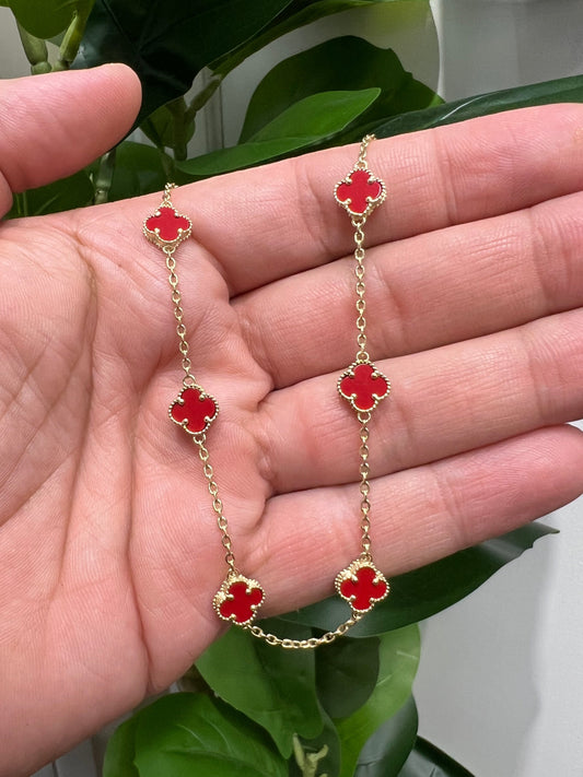 1589- NEW 14K Small Red Trebol Bracelet (8mm) 7”+1” Ext W.G