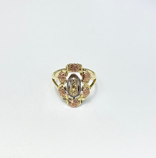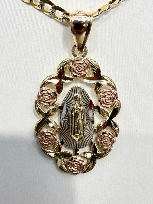 1612- NEW 14K Tri-Color Gold Our Lady Of Guadalupe Floral Pendant W.G