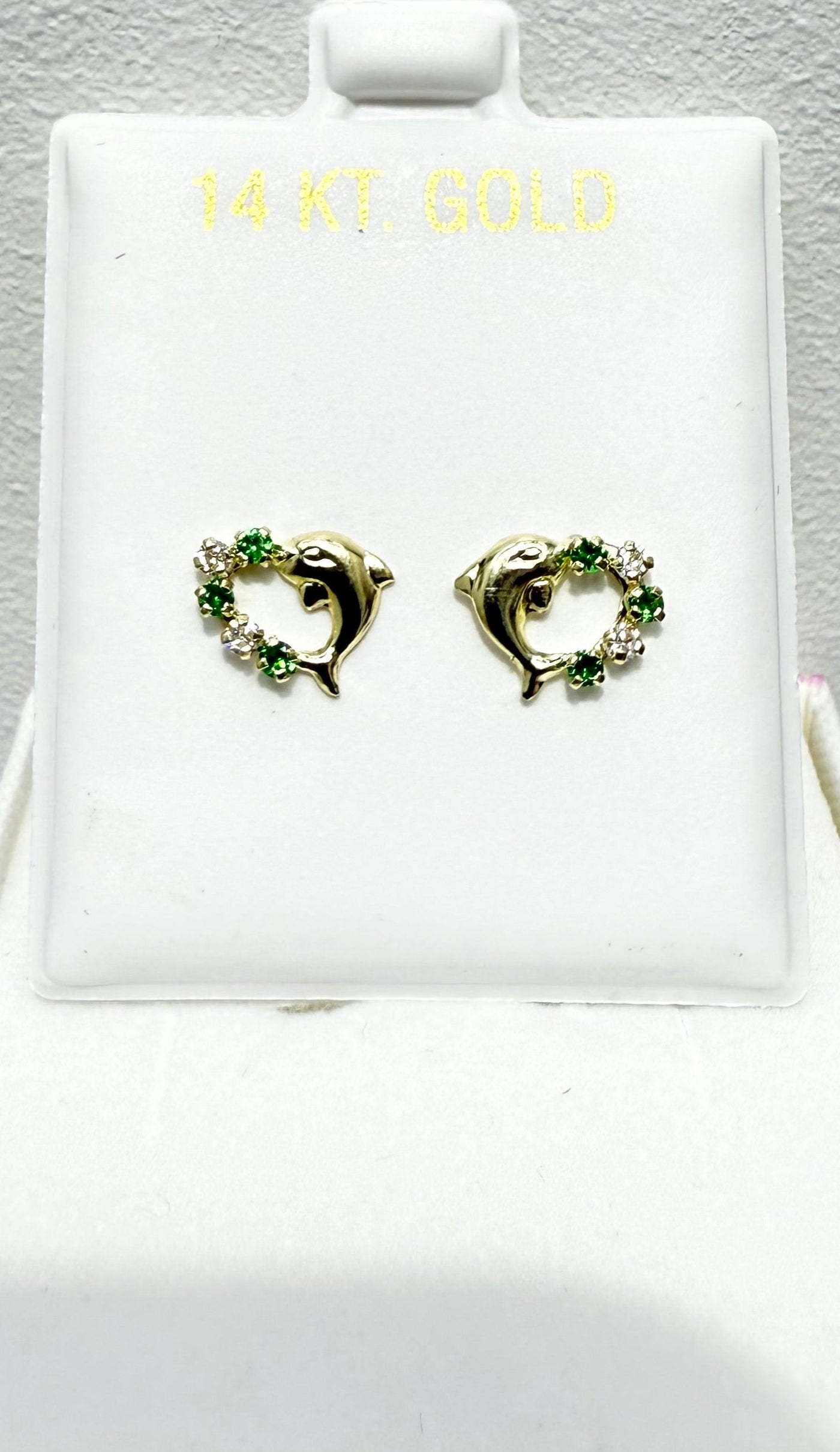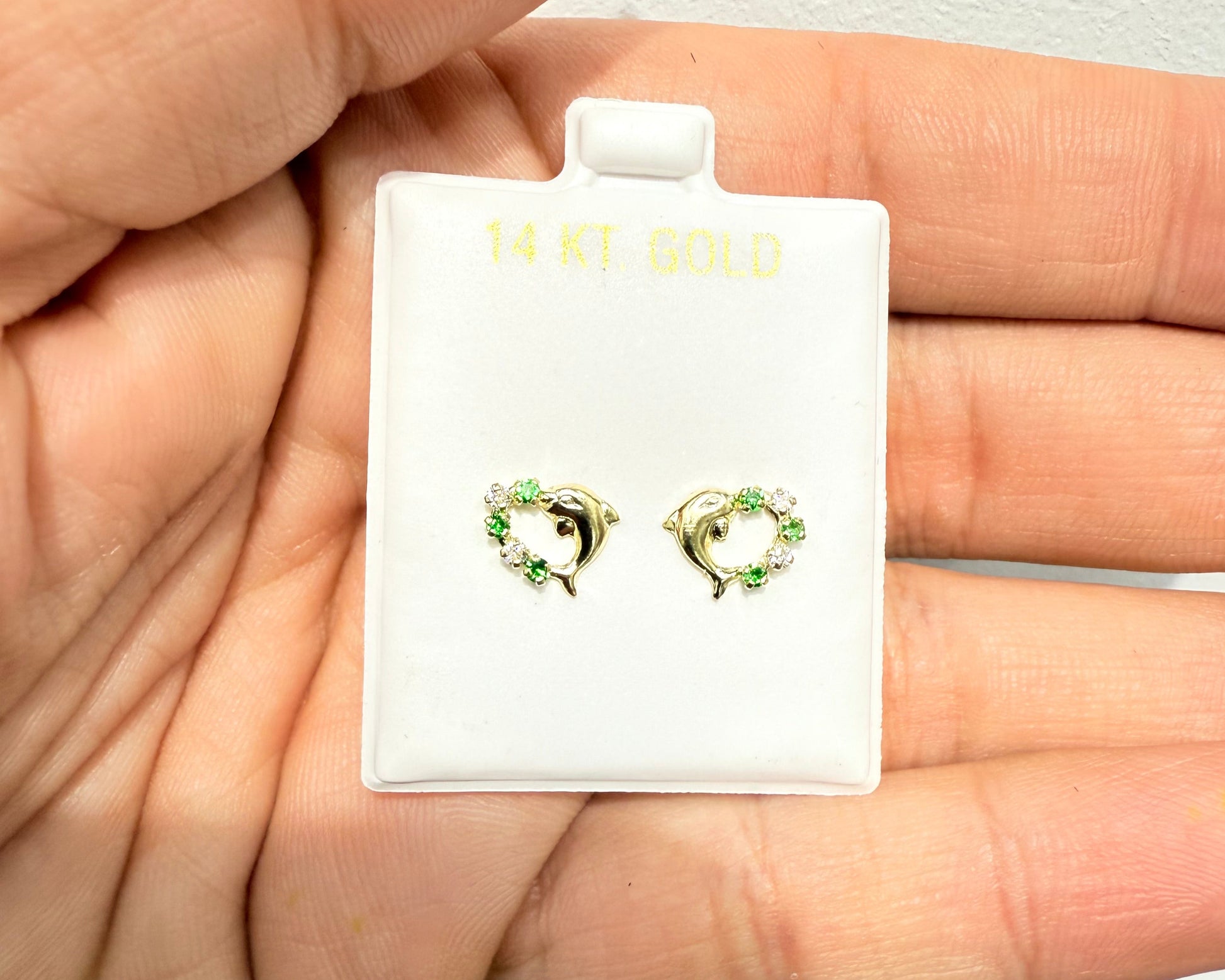 1066-NEW 14K Heart Shape Dolphin & Green Cz Stone Stud Earrings W.G