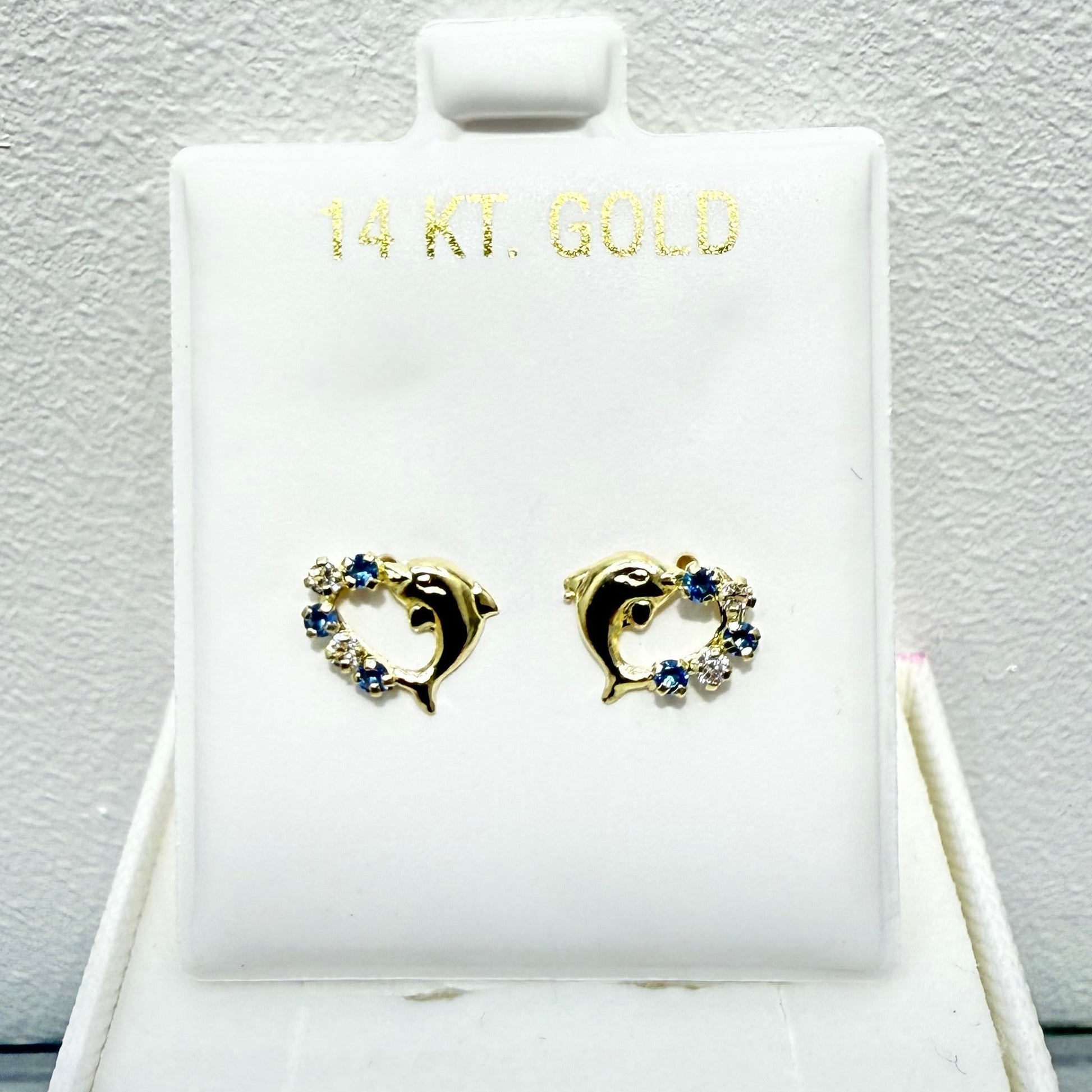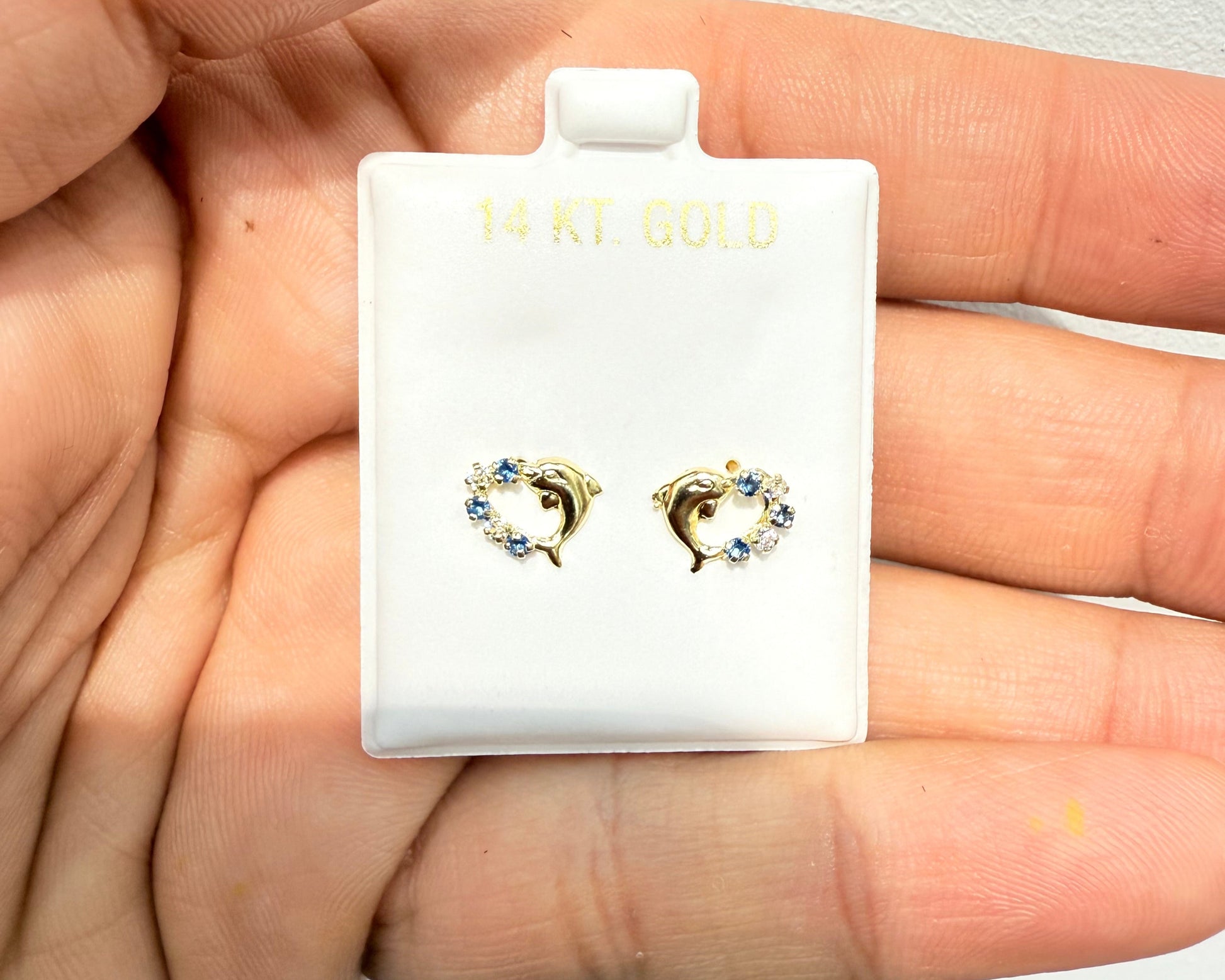 1067-NEW 14K Heart Shape Dolphin & Blue Cz Stone Stud Earrings W.G