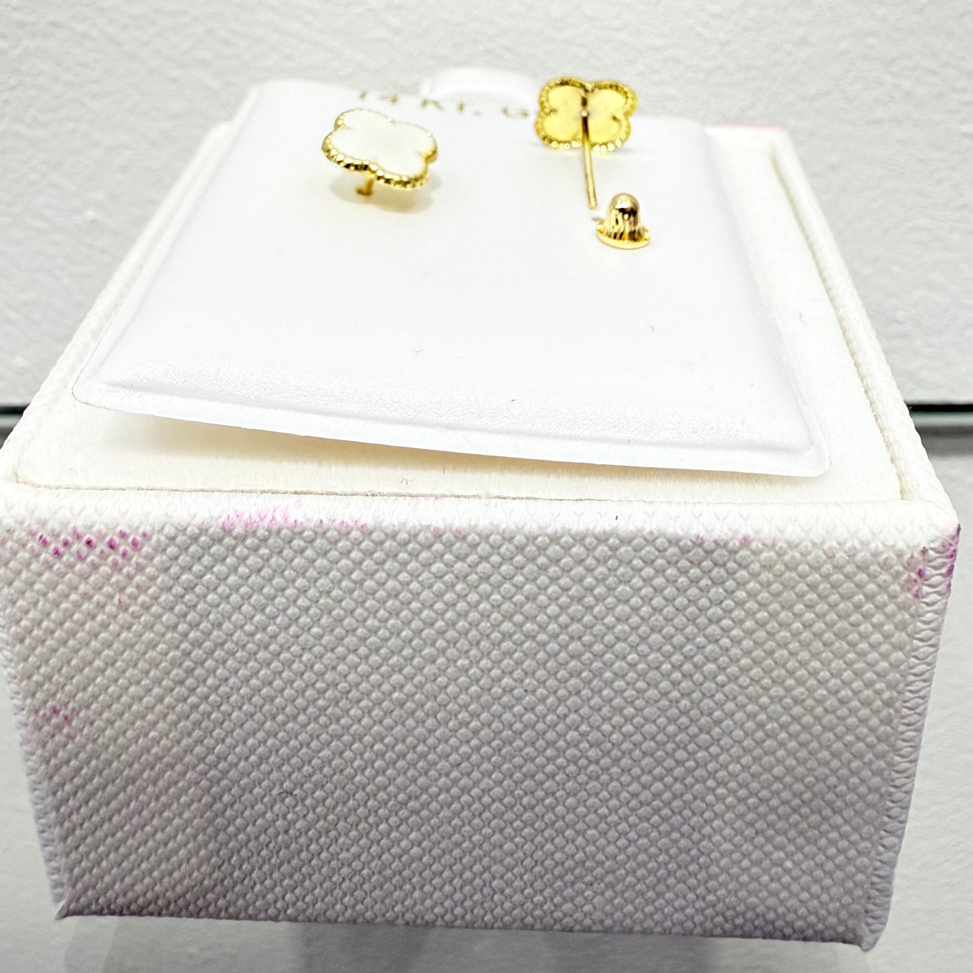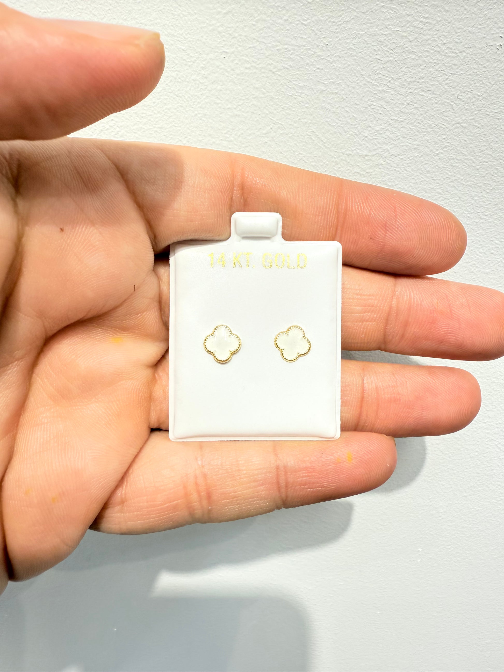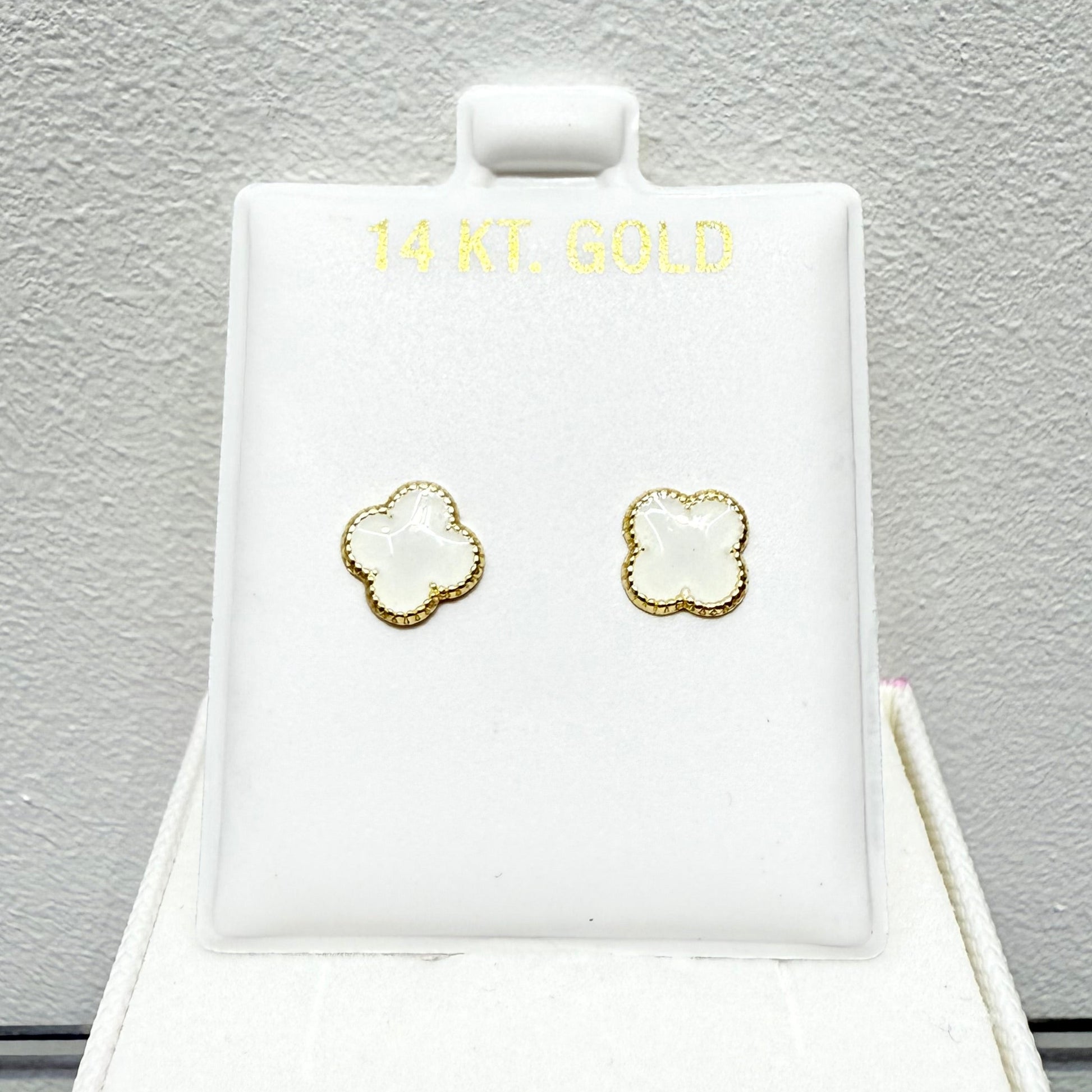 1074-NEW 14k Gold White Trebol Stud Earrings (7MM) W.G
