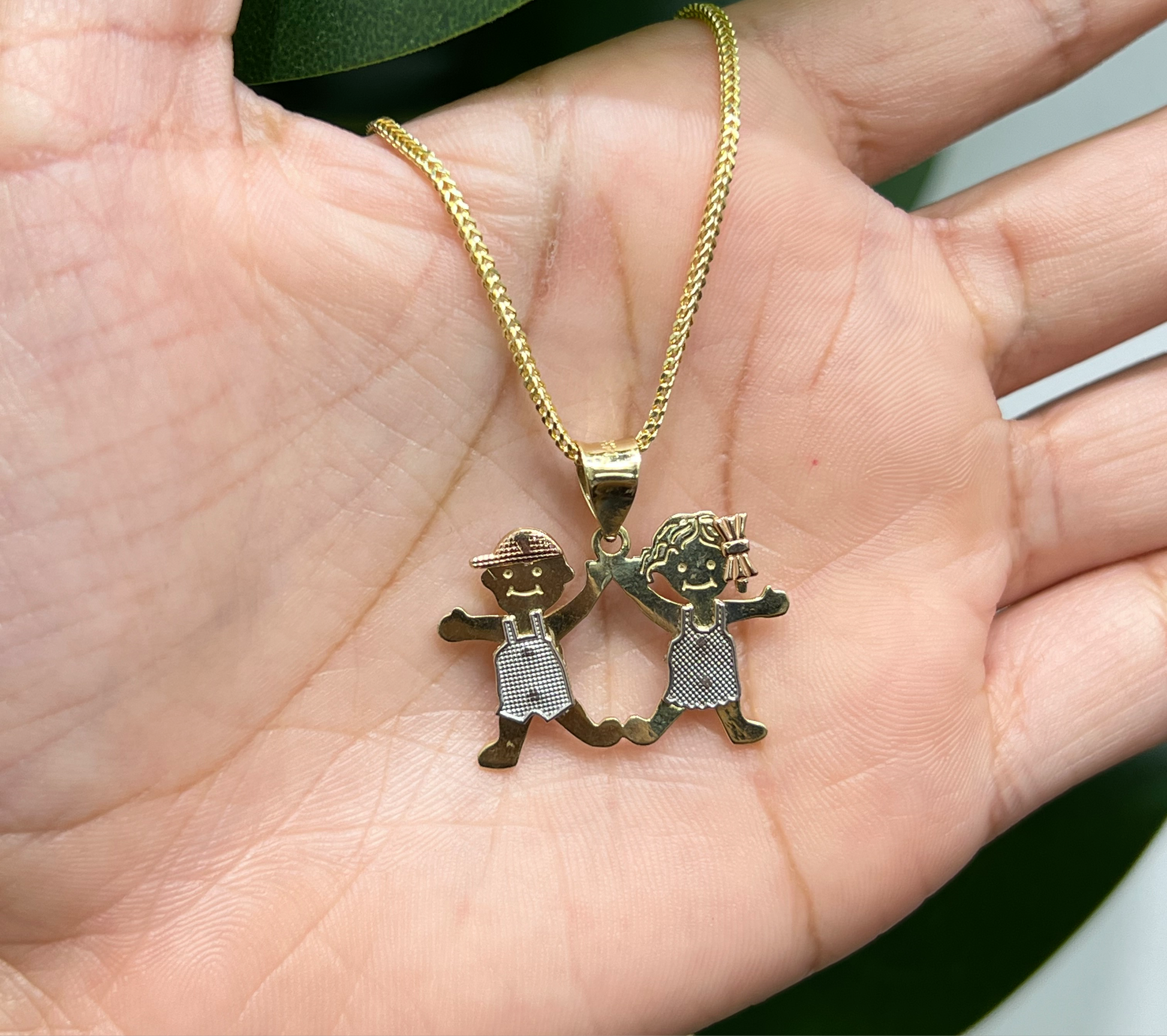 NEW 14k Tri -Toned Pendant with boy and girl wearing a hat and a bow. Made of 14k real gold.