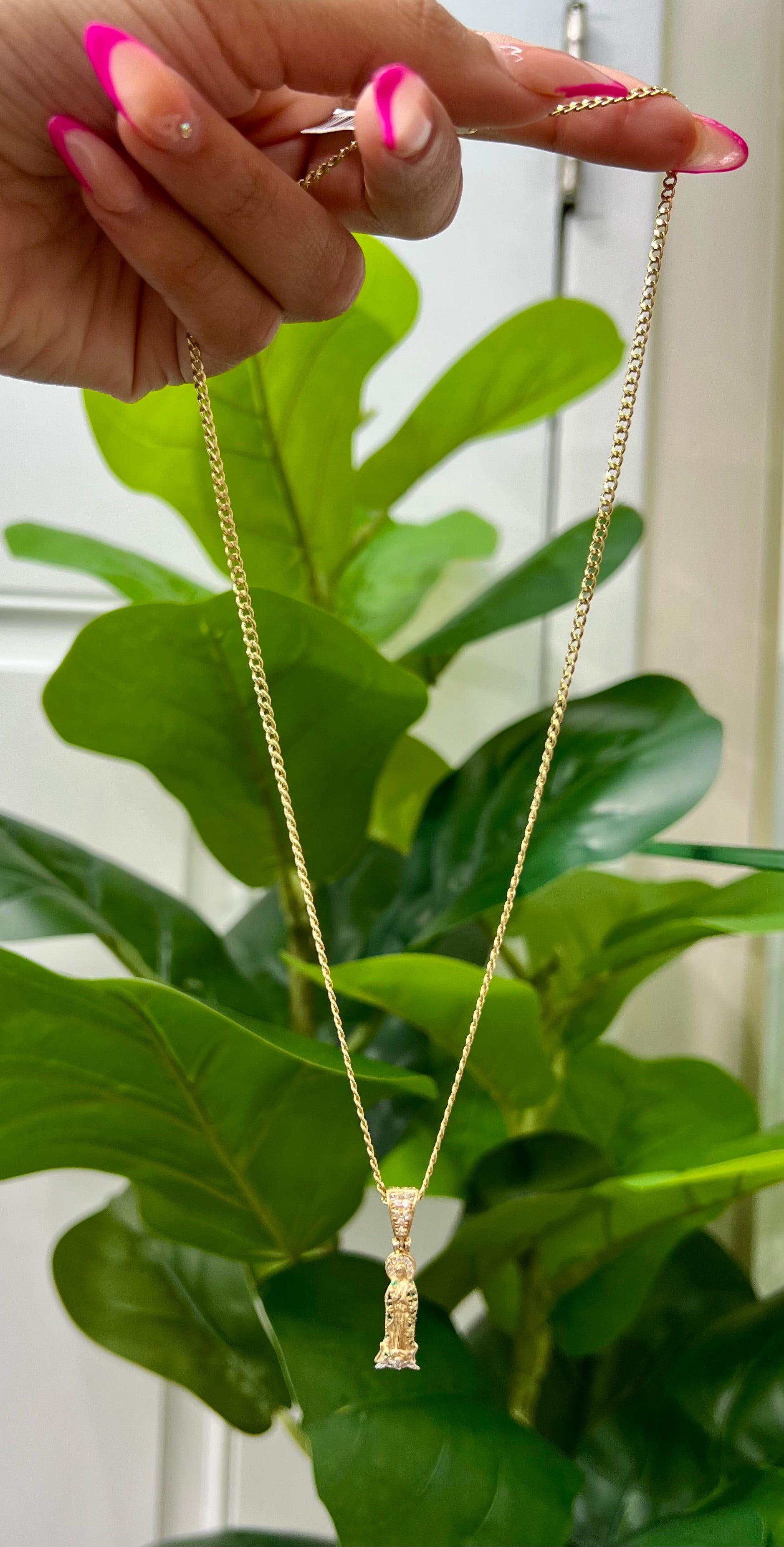 NEW 14K Miami Cuban Chain and Out lady of Guadalupe Pendant made of 14k yellow Gold