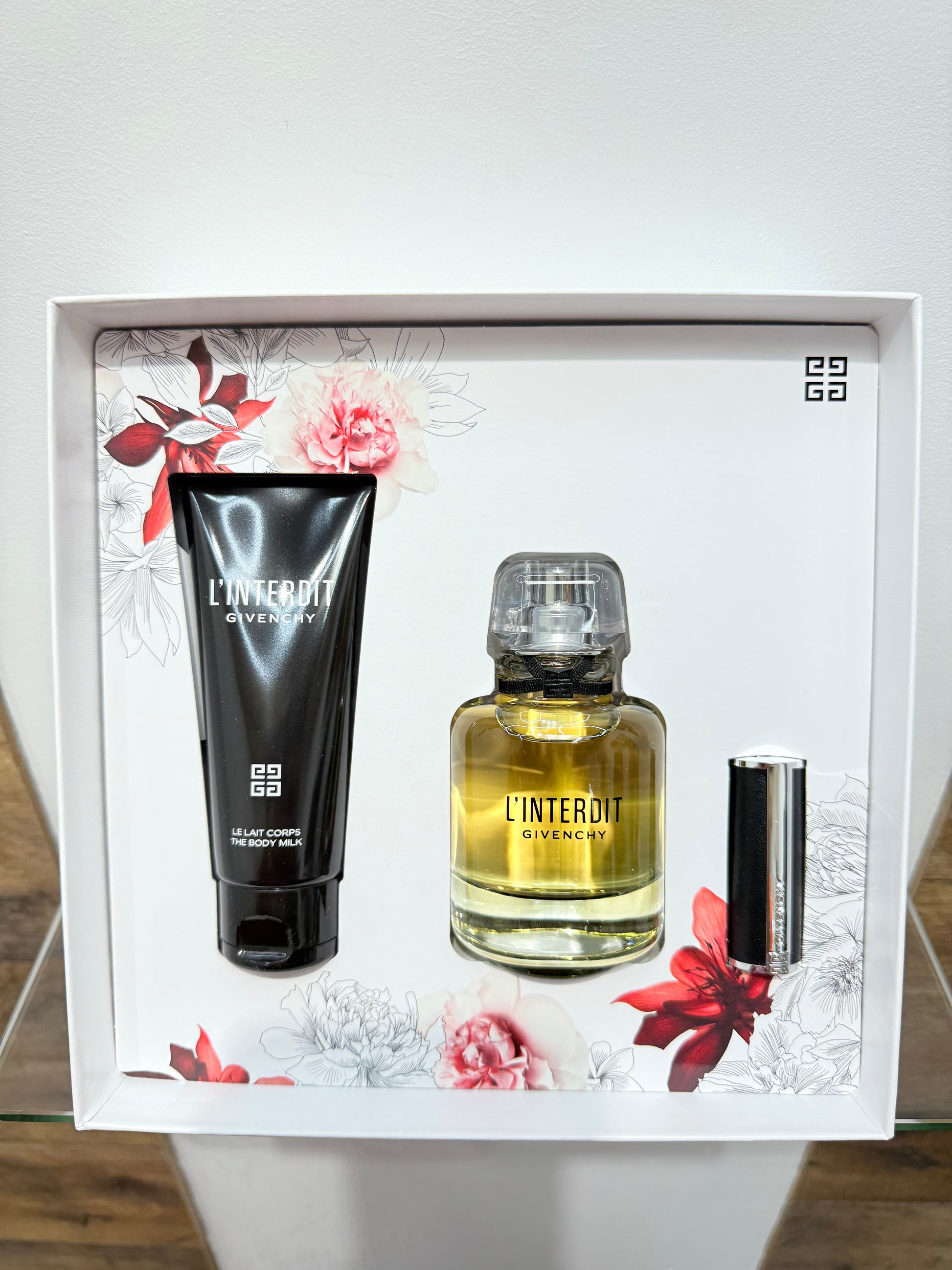 PE50- Givenchy L’Interdit Eau De Parfum Spray 2.7 oz / Milk 2.5oz + 1.5g Lipstick Women’s SET W.G