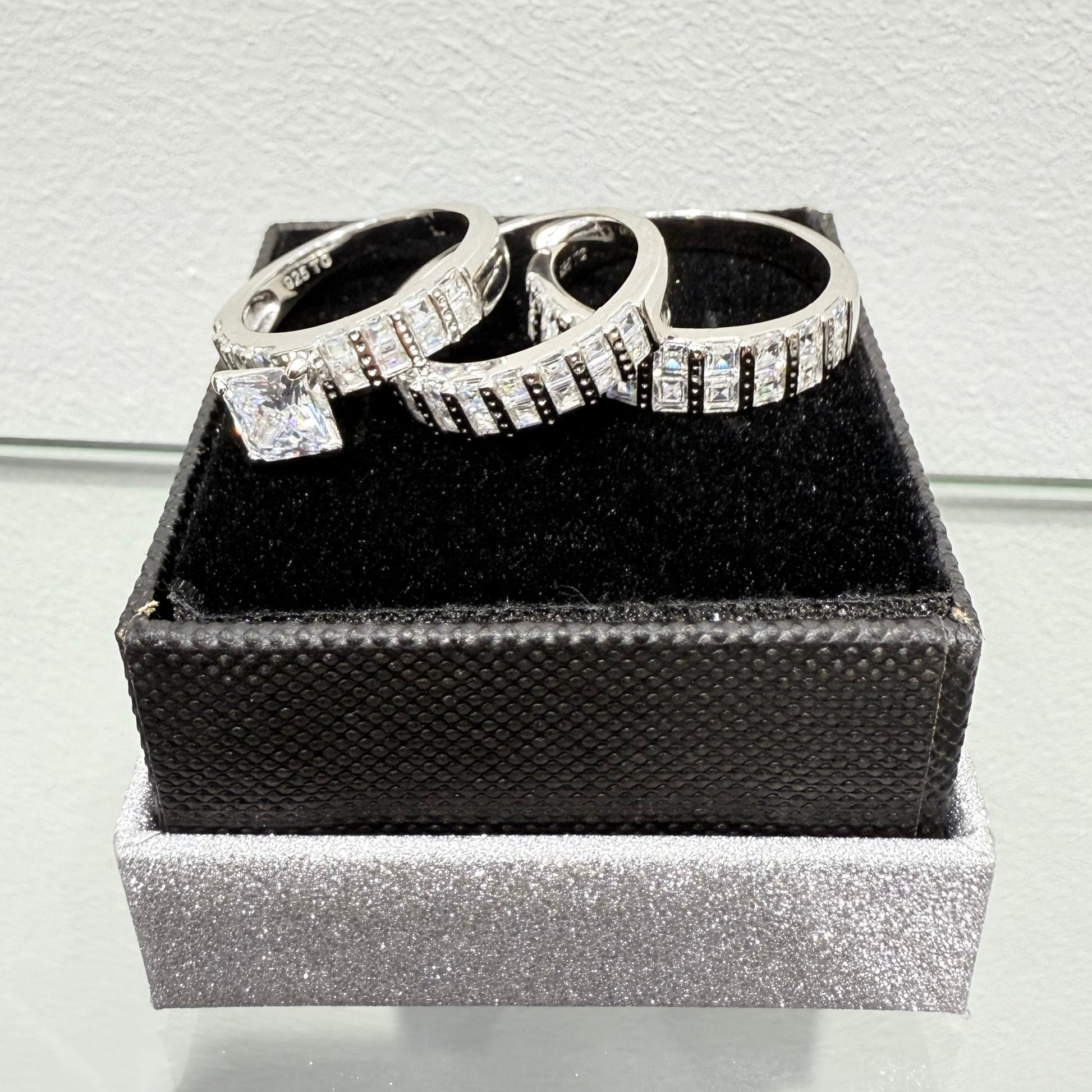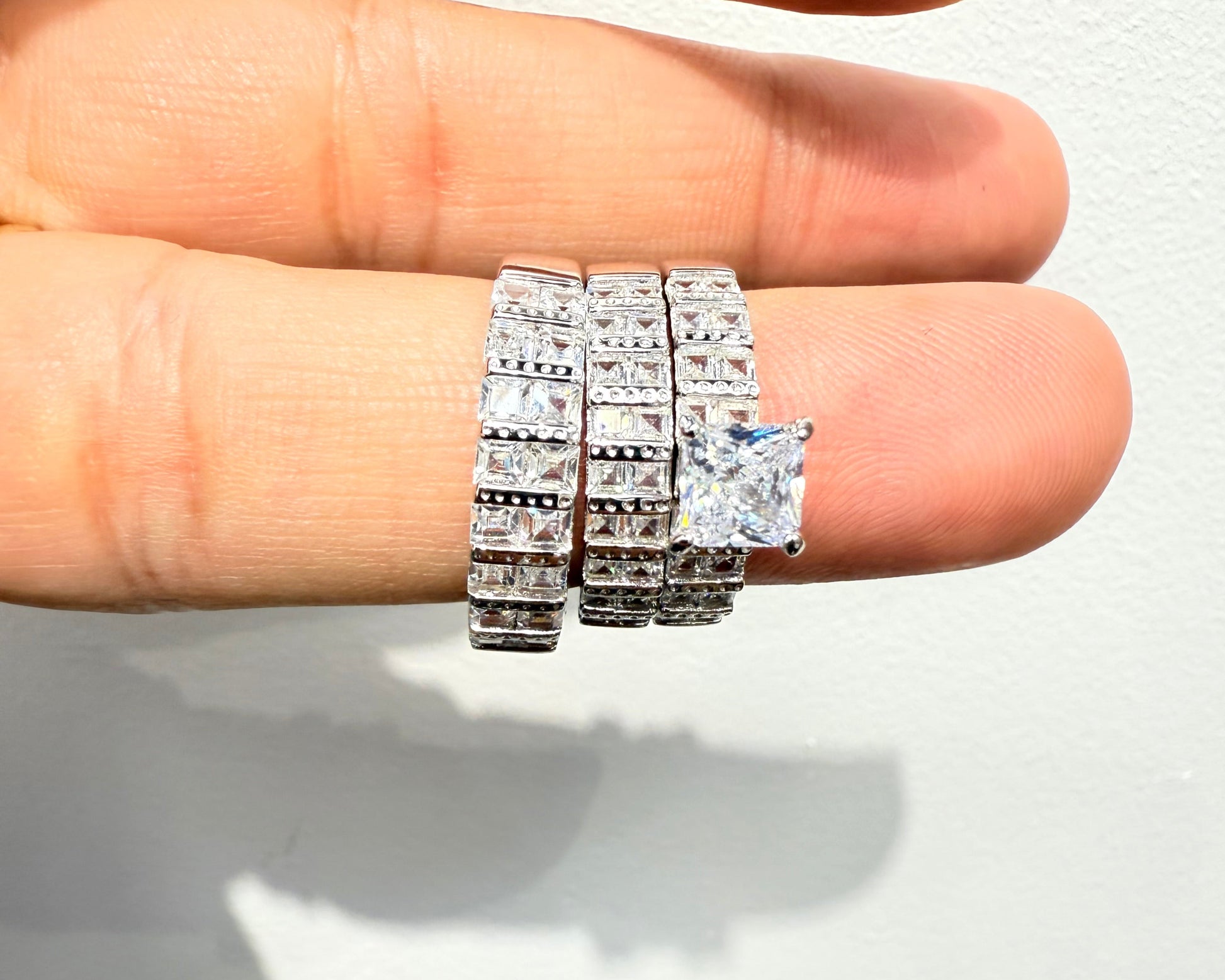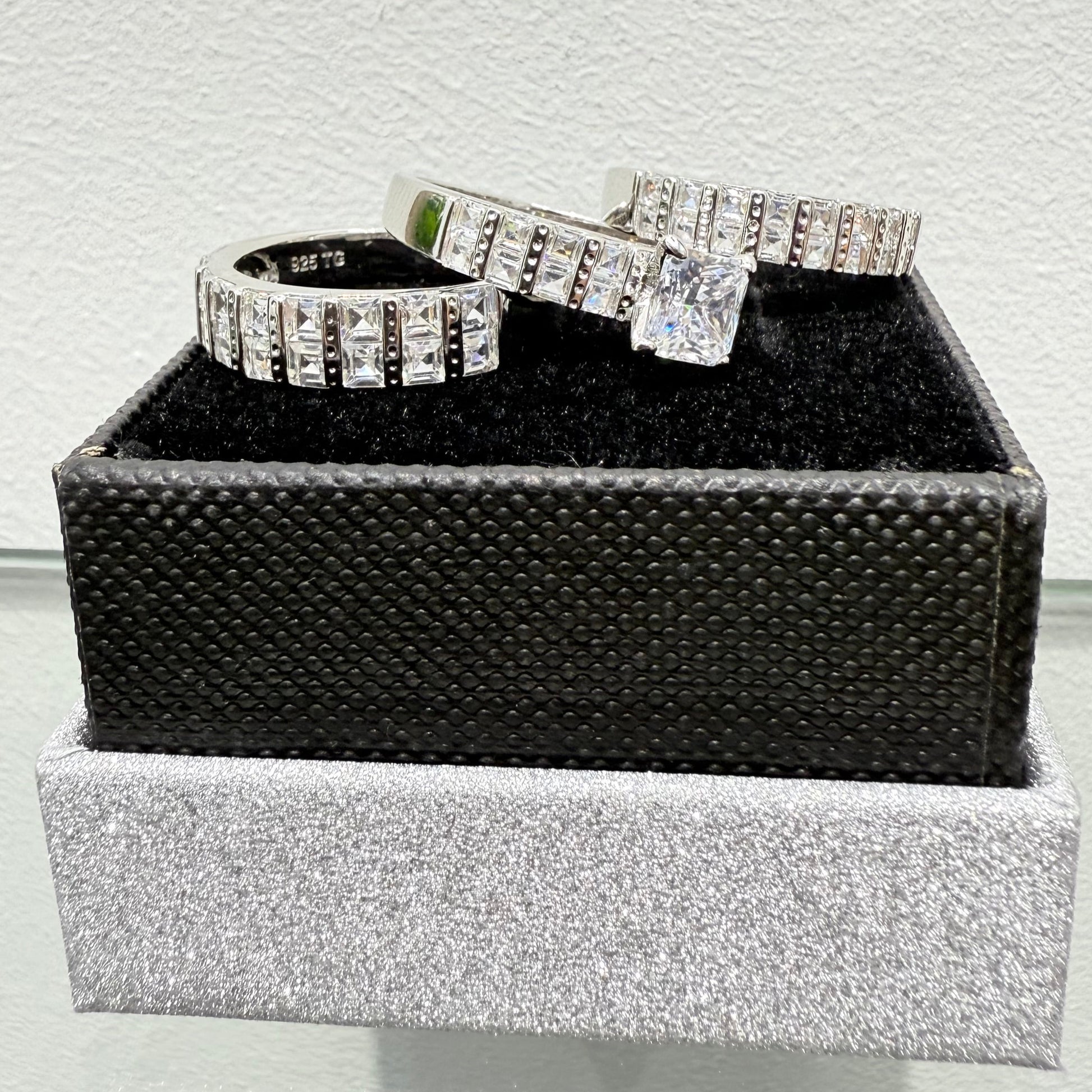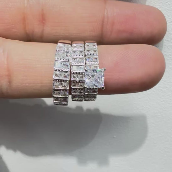 NEW .925 Sterling Silver Wedding Trio Ring Set with square zirconia stones around it.
