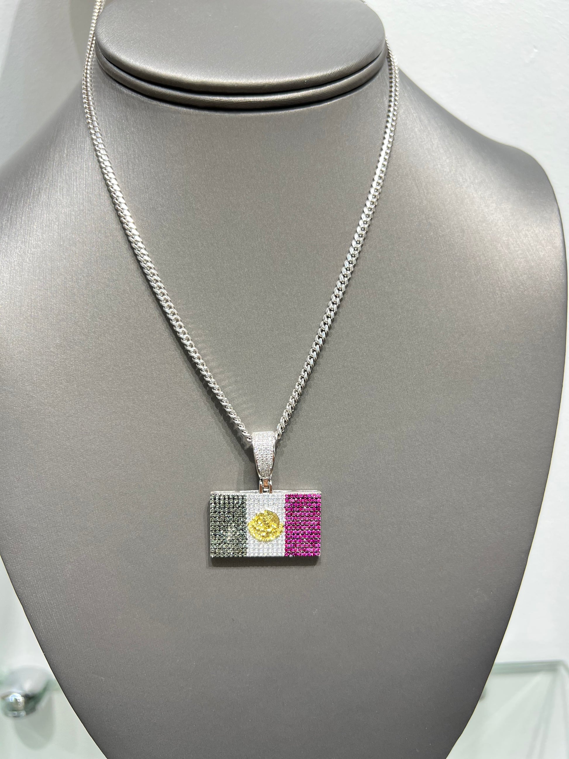 S634- NEW .925 Sterling Silver Square Mexican Flag Pendant W.G