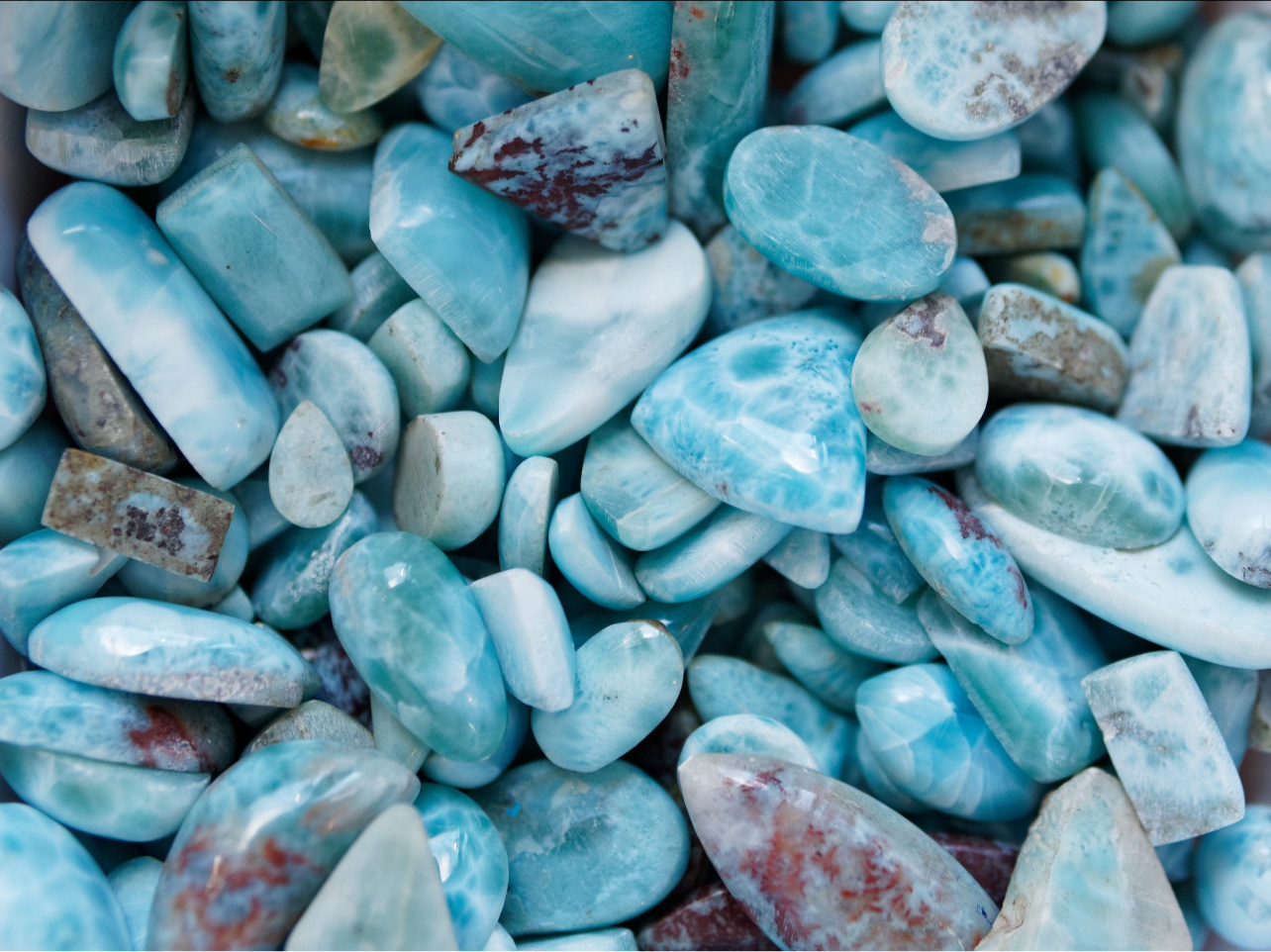 Larimar is a rare, blue pectolite gemstone and the national stone of the Dominican Republic. Its color ranges from light blue to deep blue, sometimes with streaks of white, green, or red, resembling the Caribbean sky and sea. The name "Larimar" combines "Lari" from Larissa, the discoverer's daughter, and the Spanish word "mar" meaning "sea". Larimar wasn't officially named or mined until 1974.